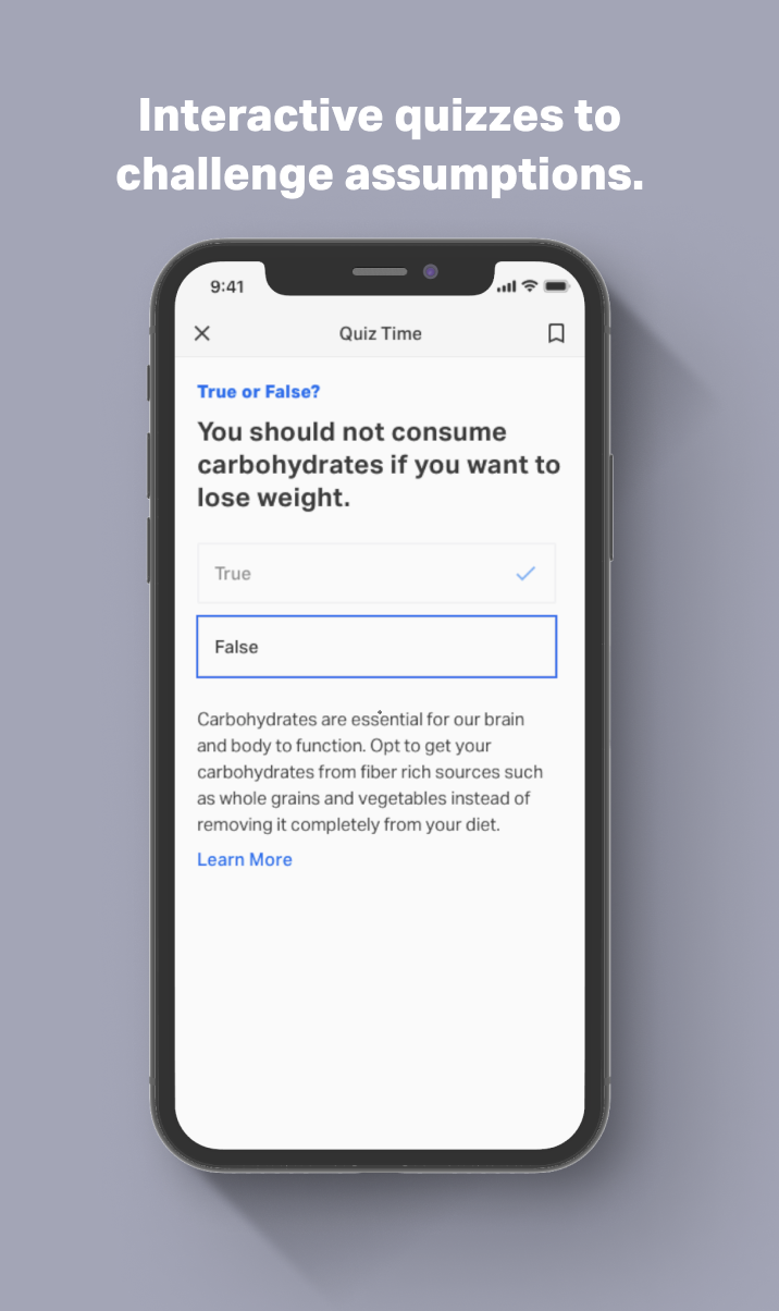 Users download our app because they are ready to take action. However, it is easy to be overwhelmed and confused by conflicting information and experience decision paralysis, bouncing around from solution to solution before results can be achieved. We need to get them started, and keep the momentum going so they can get to visible results.Make health and nutrition more accessible & approachable.